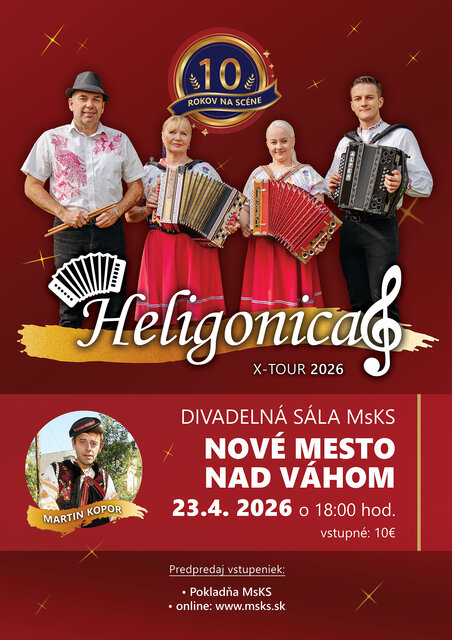 Pri príležitosti 10 výročia fungovania kapely na hudobnej scéne a takisto k vydaniu jubilejného desiateho CD nosiča sa Heligonica rozhodla zavítať do Nového Mesta nad Váhom. Na koncerte zaznejú najväčšie hity ako aj novinky z nového albumu. Tešiť sa môžete aj na ich hosťa Martina Kopora.