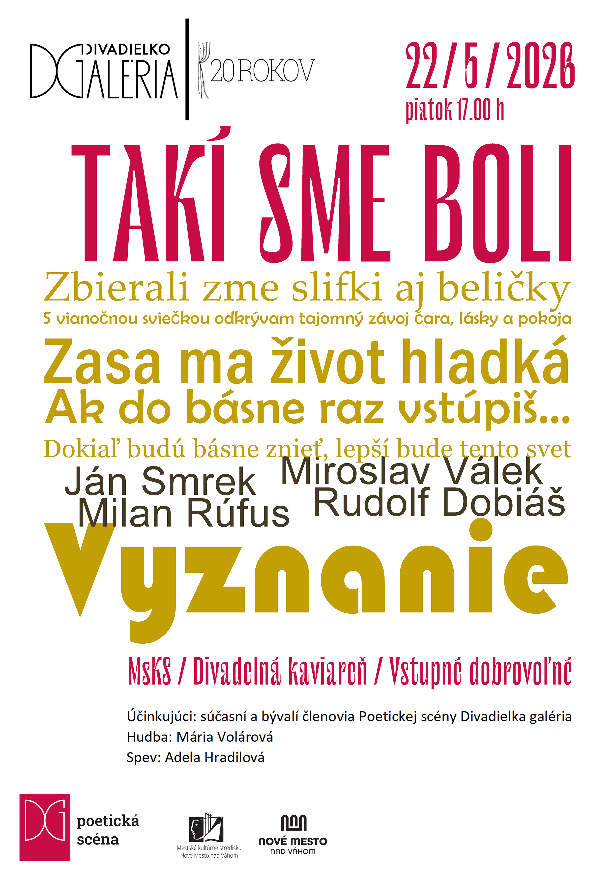 Spomienkový večer Poetickej scény Divadielka galéria pod názvom TAKÍ SME BOLI ponúkne návrat k pásmam, ktoré vznikali na samom začiatku Divadielka galéria aj počas celých 20 rokov. Svojich hostí, divákov, priaznivcov a priateľov budú sprevádzať históriou poetickej scény interpreti súčasní aj bývalí.